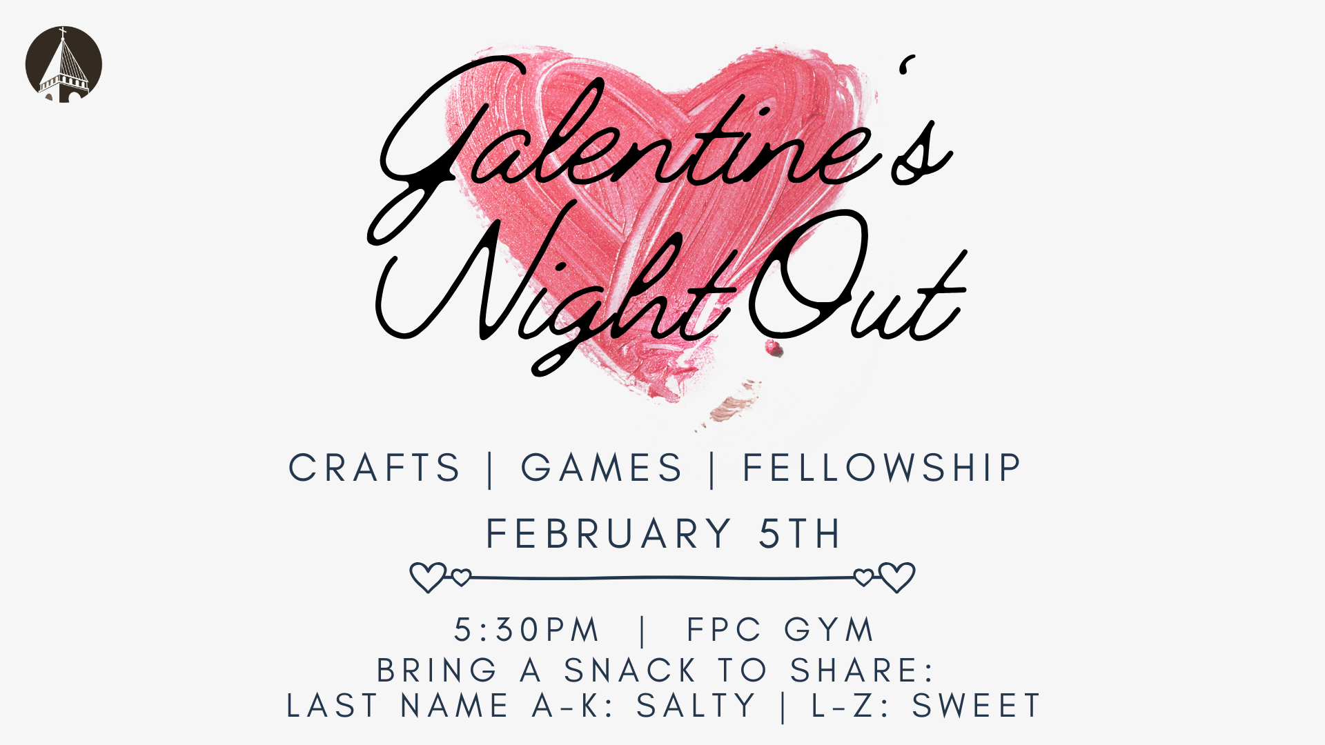 Galentine’s Night Out: Ladies, join us on February 5th at 5:30PM in the FPC Gym for a fun-filled evening of crafts, games, and fellowship. Please bring a snack to share. Last names A-K bring a salty snack, L-Z bring a sweet treat. Invite a friend.