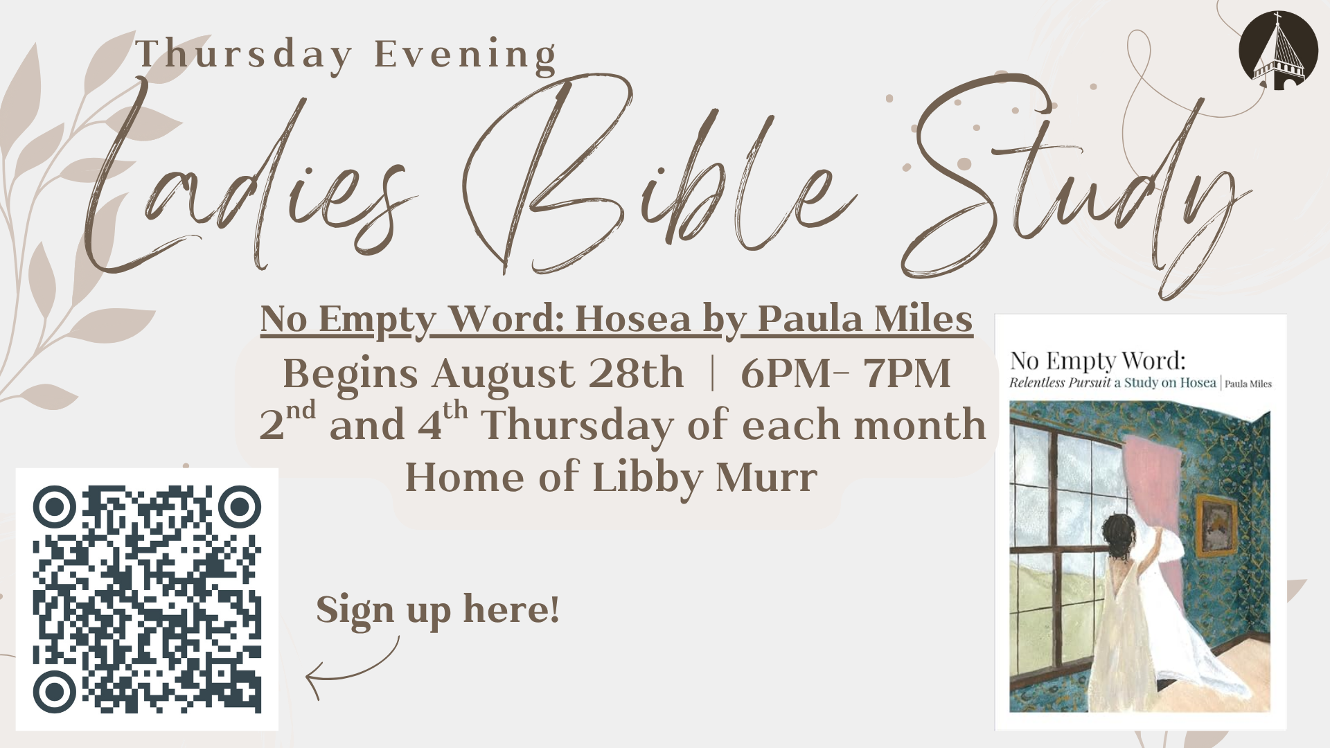 This study will meet on the 2nd and 4th Thursdays of each month and will use the book No Empty Word: Relentless Pursuit, a Study on Hosea by Paula Miles. Please sign up using the QR code. Donations for the book are welcome and may be made via the same code. Note: Childcare is not available for the evening study.