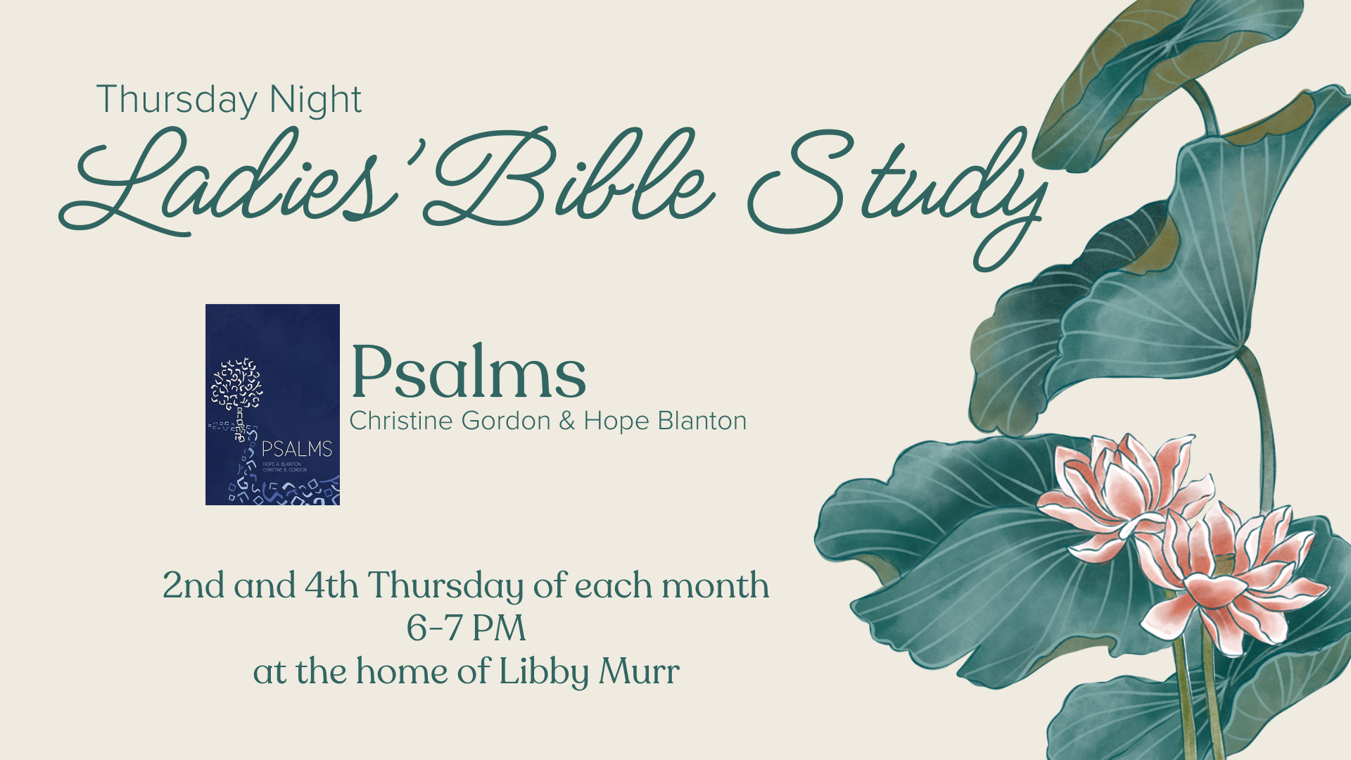 This study will meet on the 2nd and 4th Thursdays of each month. Our study is Psalms by Christine Gordon & Hope Blanton. Note: Childcare is not available for the evening study.