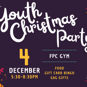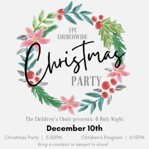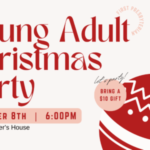 Young Adult (18-35) Christmas Party: We will meet on Monday, December 8th, at 6:00PM for our annual Christmas party at the home of Pastor Gardner & Sarah Fish for food, games, and fellowship. Bring a $10 gift.
